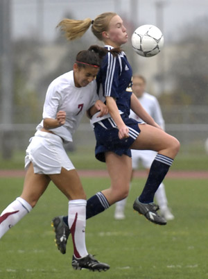Midfielder Christina Libke (left) of Lincoln challenges Central Catholic midfielder Taylor Carlstrom (right) for a loose ball during the first half of the OSAA 6A Girls State Soccer Championship at Liberty High School in Hillsboro, Oregon. Photo ©