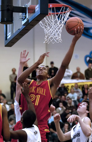 Thimpkins (33) of Oak Hill shoots a sky hoop over South Eugene's EJ